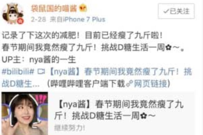 在BiliBili很有人气的网红体验了一周控制糖分的饮食生活,用视频拍摄了减肥成功的样子。她本人也实际吃了一惊,正常吃饭却瘦了下来,成功地向观众诉说了真实性。销量大幅增加,获得了很多粉丝。